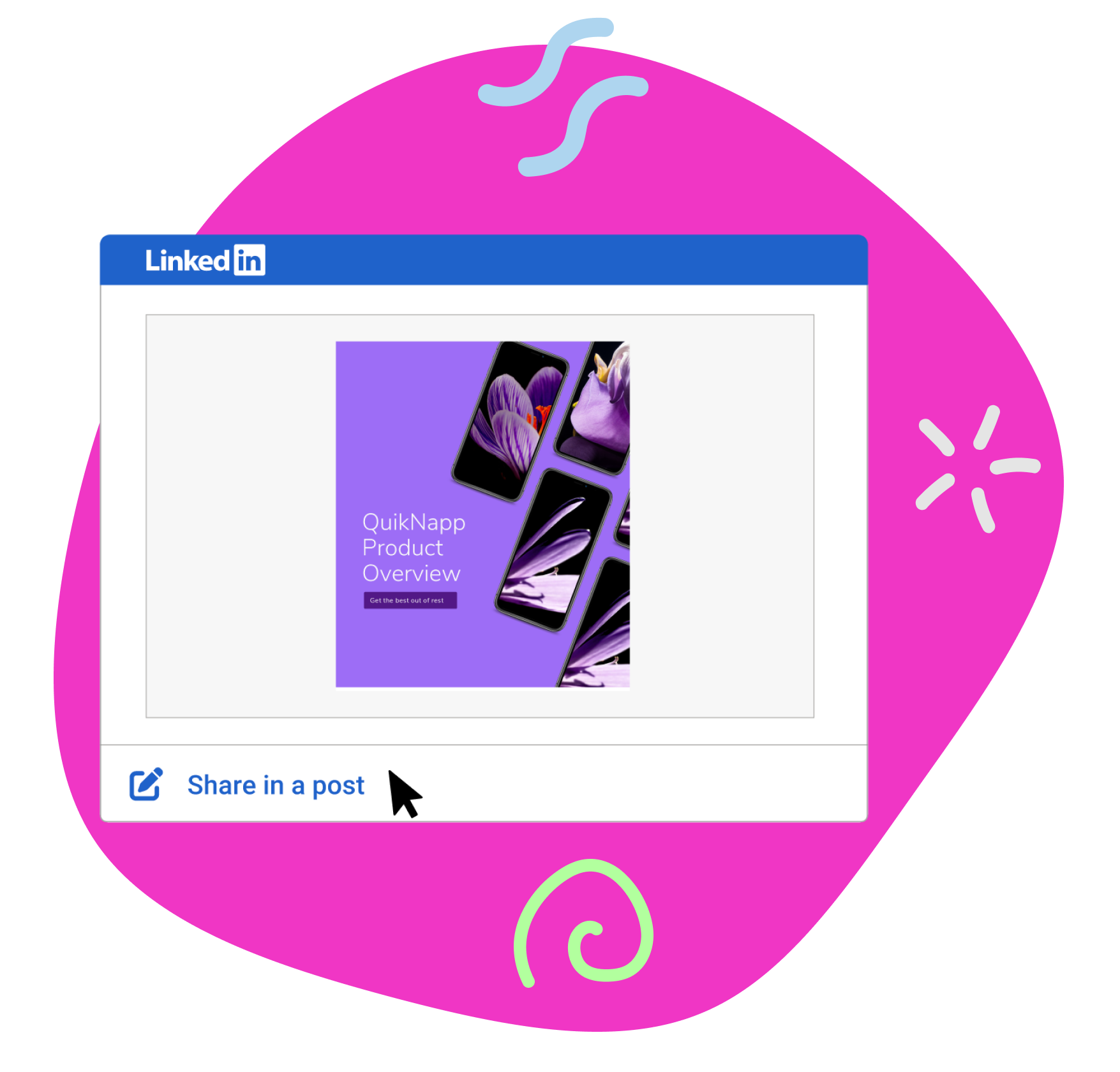 Our LinkedIn integration makes it possible to post your Simplebooklet to your feed. Post a clickworthy cover image of your Simplebooklet that links right to your live Simplebooklet. Access the LinkedIn integration from the Share tab of any Simplebooklet.